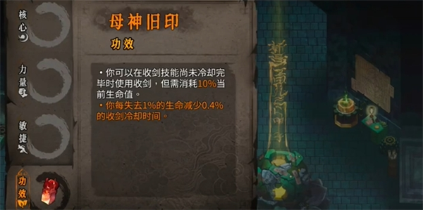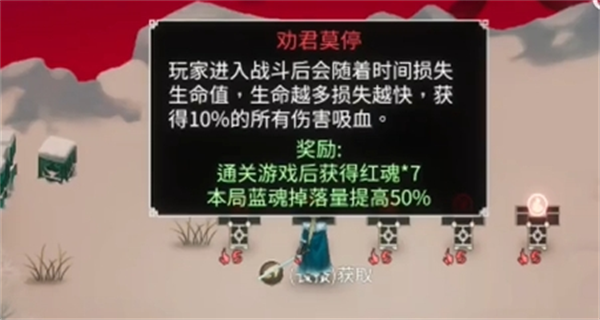 效果是消耗生命,就可以立即使用收剑技能,如果害怕暴毙的玩家可以配合红魂挑战的【劝君莫停】,其效果是全能吸血,两者结合就可触发永动机的效果
