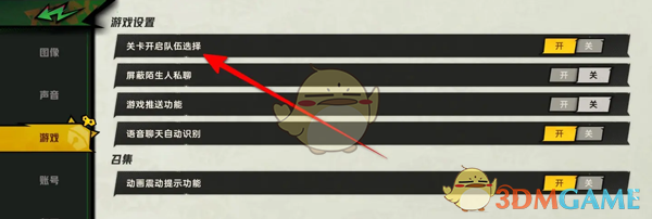 3、最后在游戏设置页面,点击关卡块钱队伍选择,将该选项开启即可。