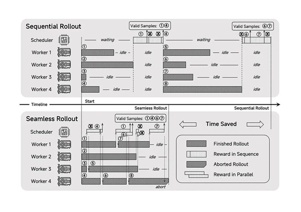 框架:设计了Seamless Rollout系统,使得RL训练加速2.29倍,验证加速1.96倍。