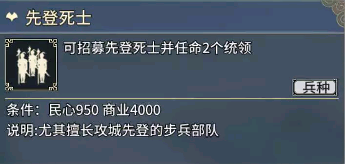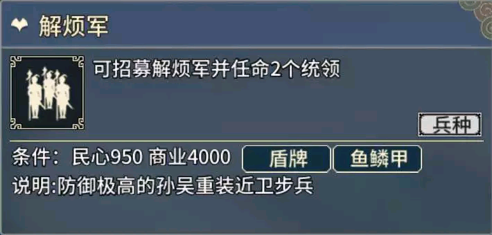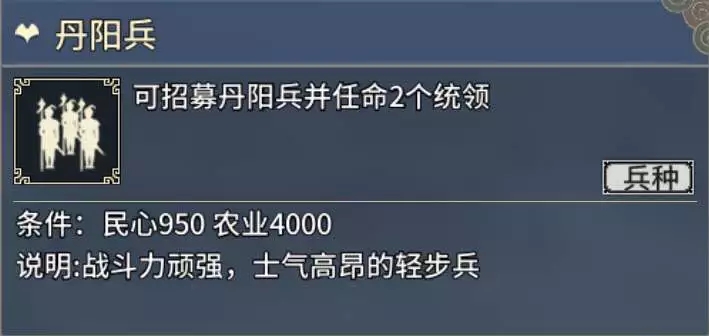 使用:东部最强步兵虽然不是它(而是解烦军) ,可是四个虎符量足,步兵适应性强堪为战场主力。中东部大部分势力取得广陵很easy,而东吴老家建业又是值得发展的大城,所以丹阳-解烦组合和西部的连弩-无当组合一样都是战场主角。