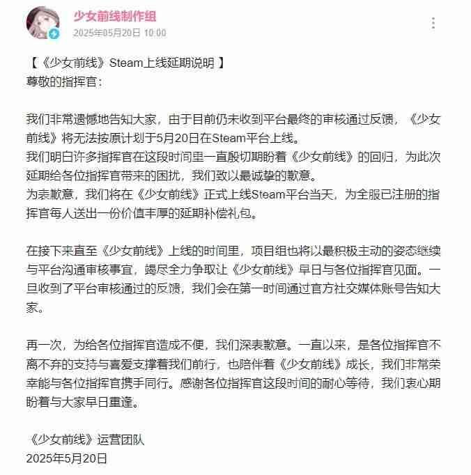 此前,《少女前线》官方曾宣布,尽管国服版本已经在2024年12月31日停止运营,但计划在steam平台上推出一款“继承版”,预计于2025年5月20日正式上线。