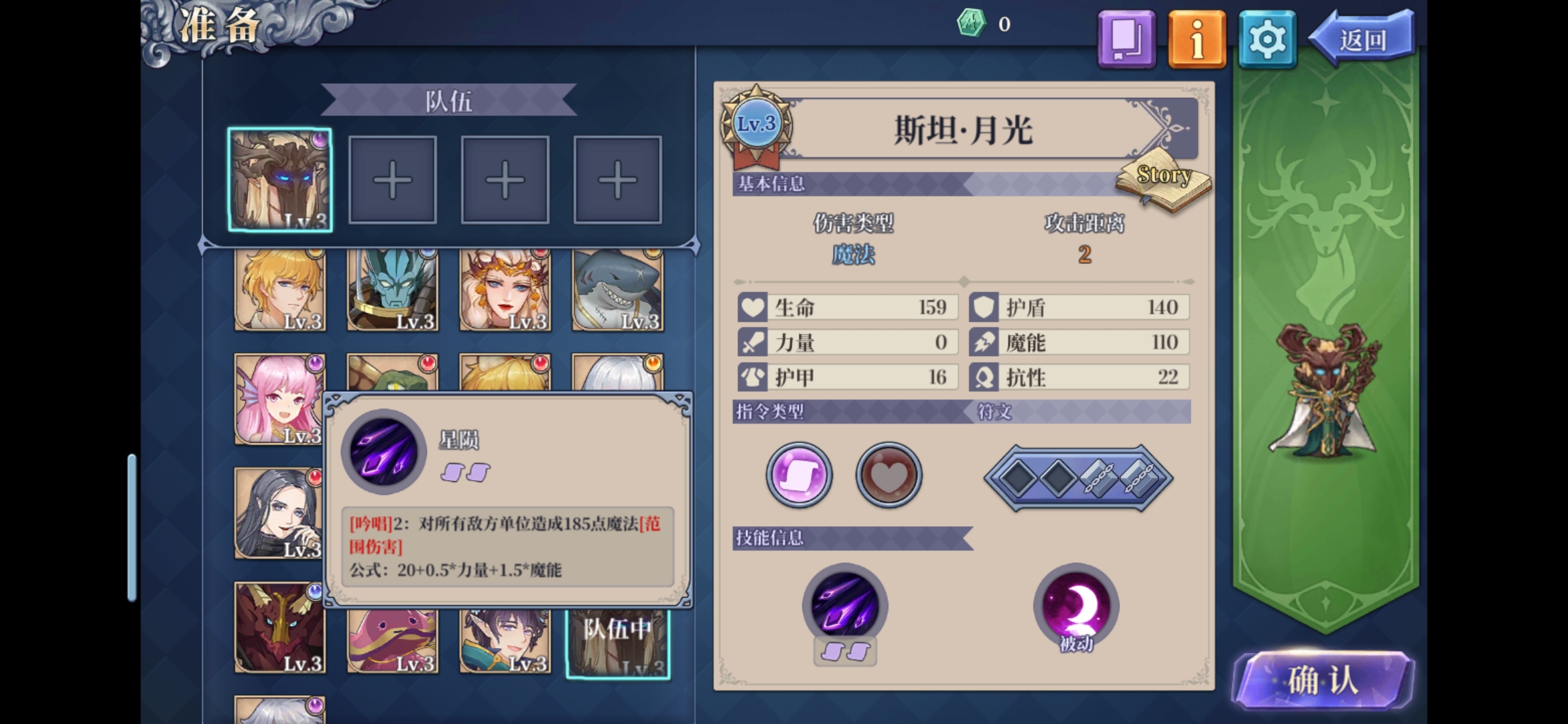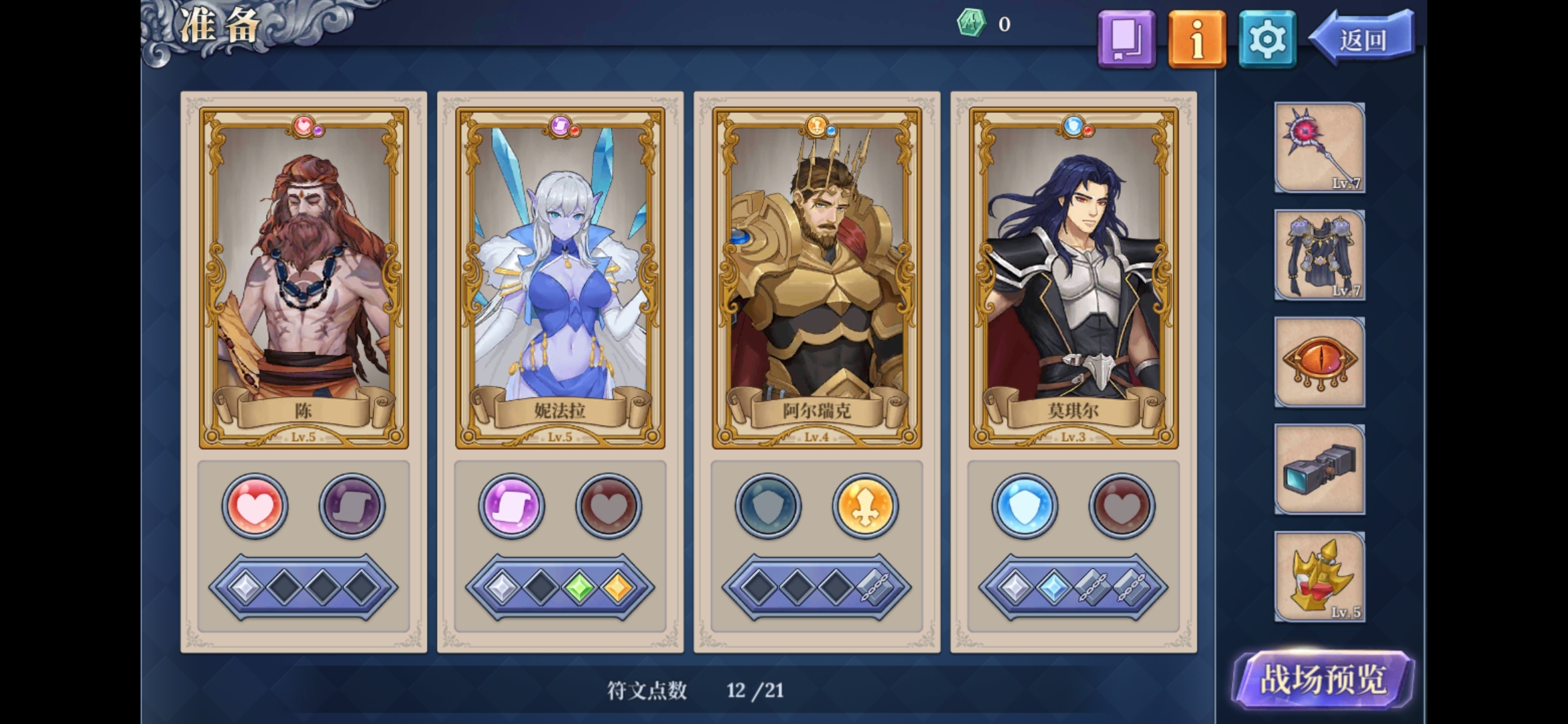 搭配建议:斯洛·月光(带书,可辅助刷盾清怪),没有的话亚希莫夫或雨莱有一个即可(补足二书),剩余建议艾米莉亚(无蓝耗奶妈)