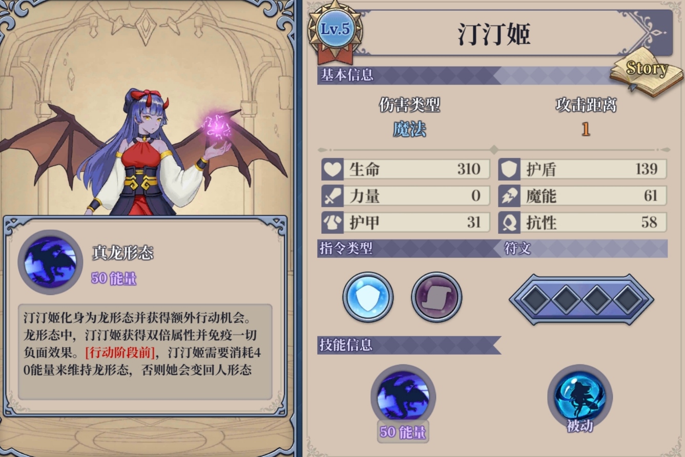 开局汀汀姬变身,消耗4指令无敌的同时攻击,如果有额外回蓝/回血指令时,一同消耗掉。(或者可以选择不点1号符文,只消耗50能量变身,这样可以100%实现汀汀姬第一回合变身攻击-水母回复指令-鲨鱼横扫的连段。)