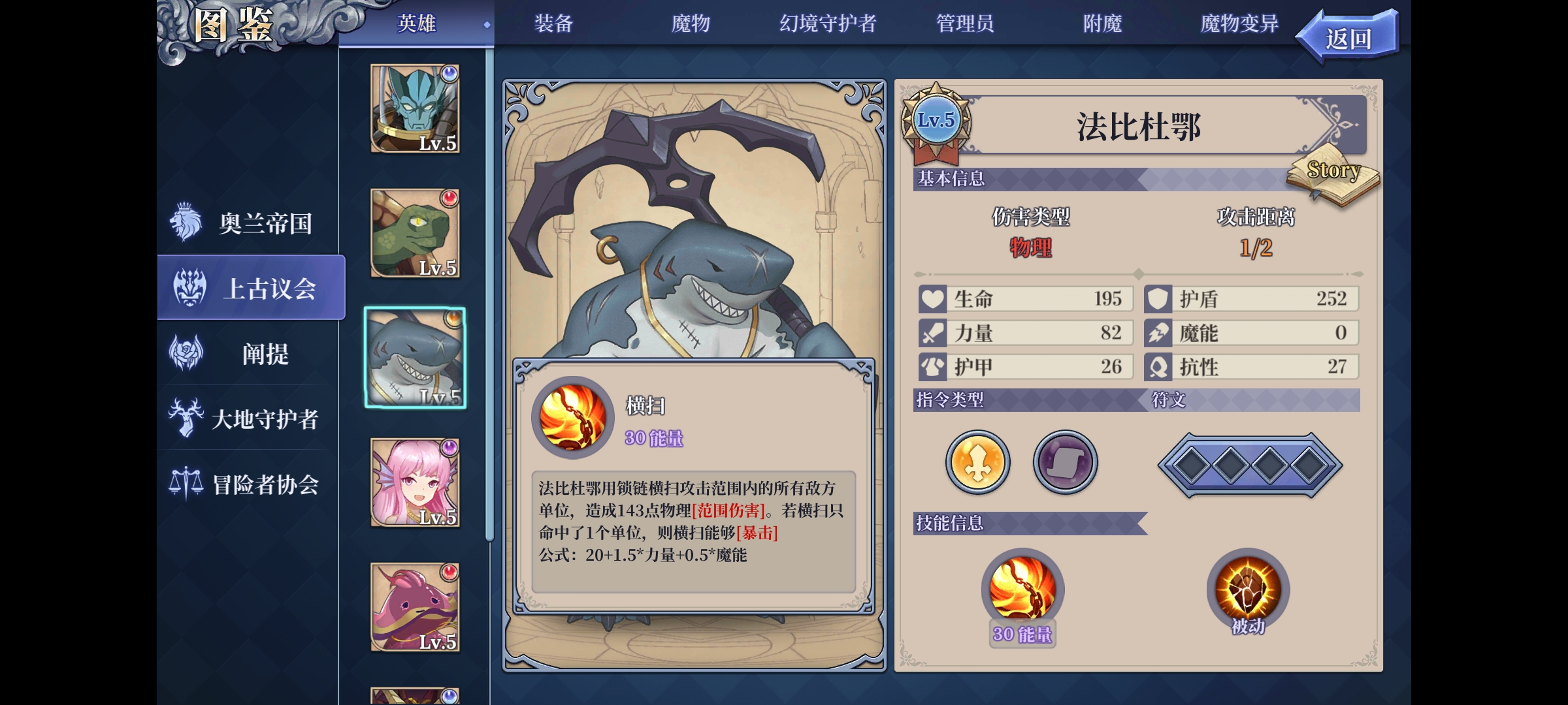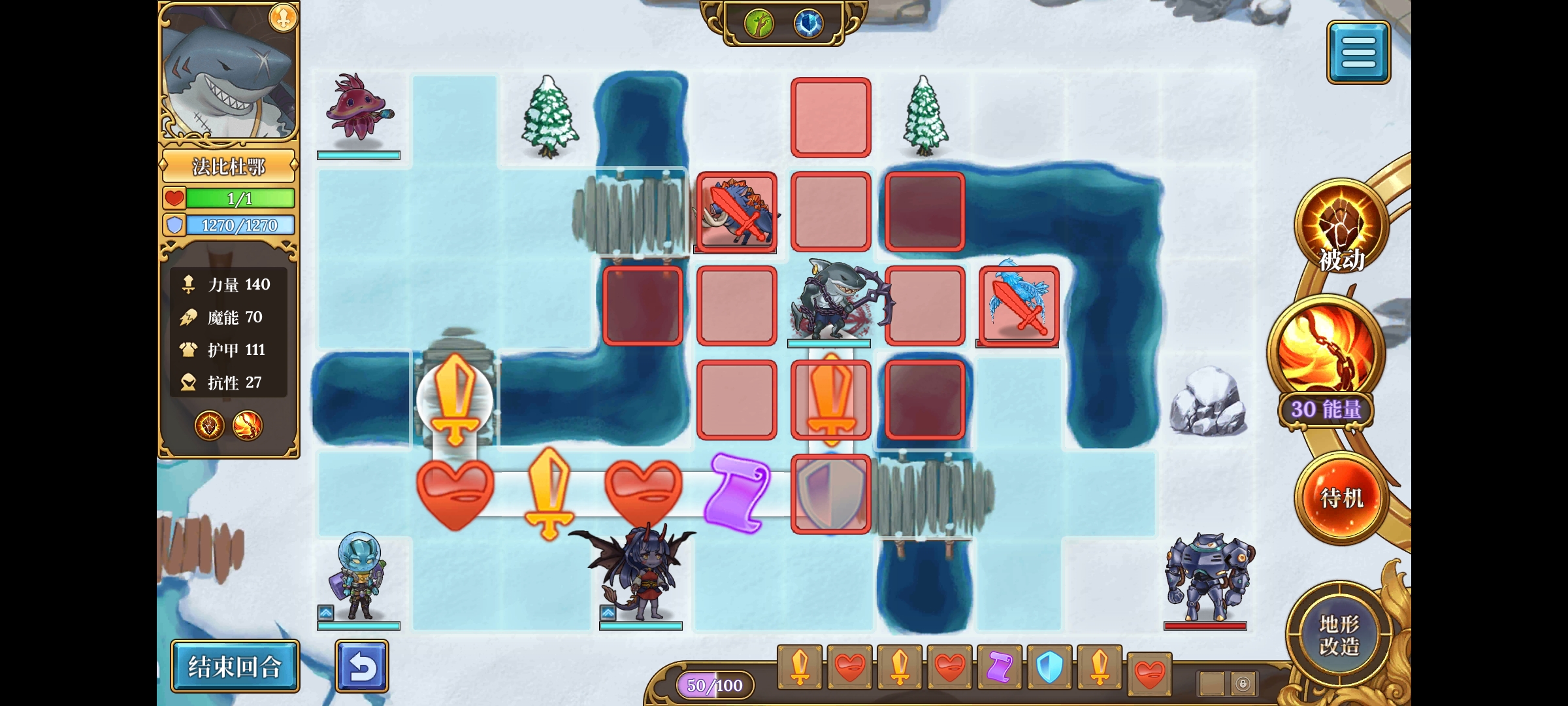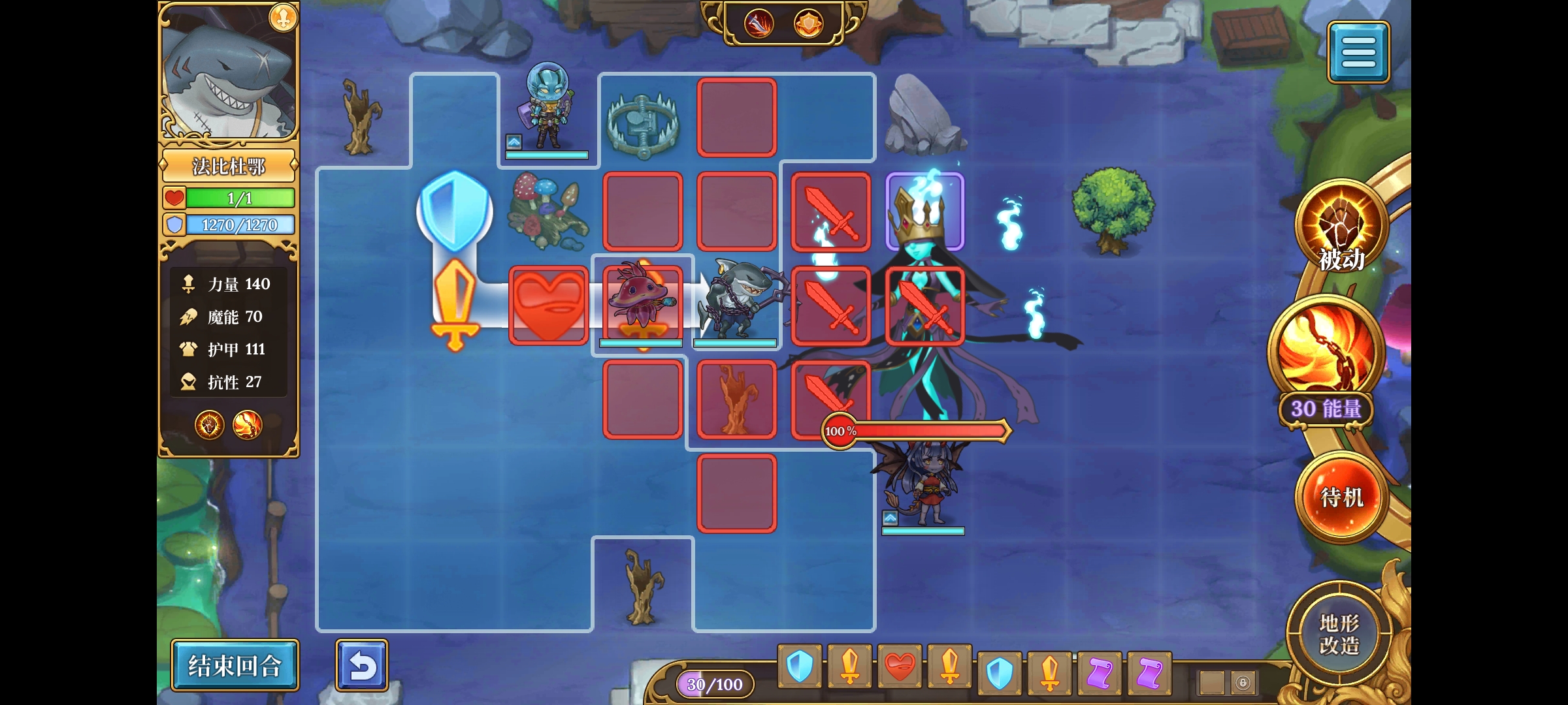 主动技能-横扫,攻击范围是2格,所以可以在第一回合汀汀姬把站得比较散的怪点掉后,鲨鱼上去横扫把站得比较密的怪清怪,从而实现快速清图;或者遇到幽灵女皇这种需要击破头上皇冠/清光侍女才能对其造成伤害的boss时,