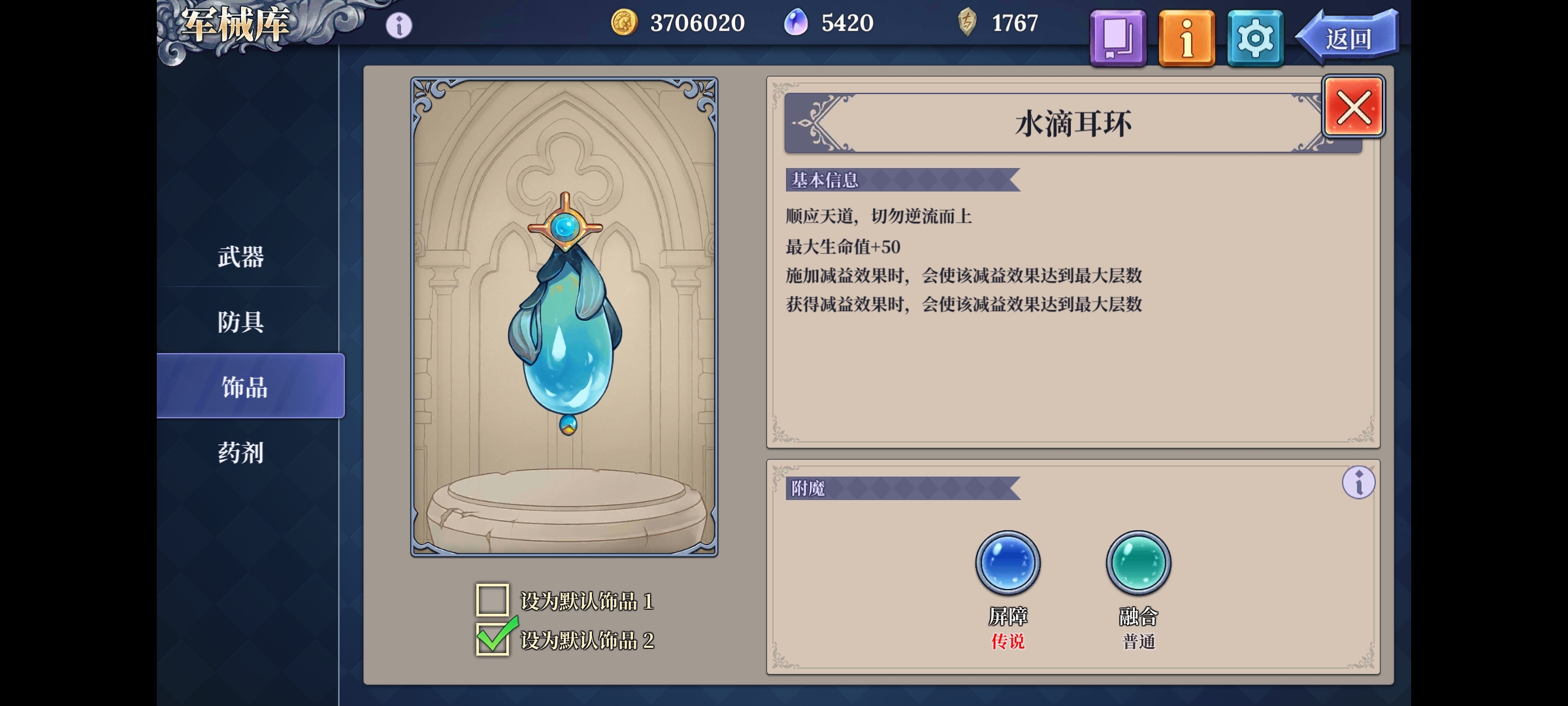 装备:元素战歌(武器)、零号机甲(防具)、黑暗法典(饰品)、水滴耳环(饰品)、能量精华(药剂)