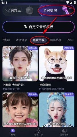 1、打开进入通义app后,在“全民舞台”点击“对口型唱歌”,接着选择“全民唱演”,然后从“爆款热歌”中挑出一个模板;