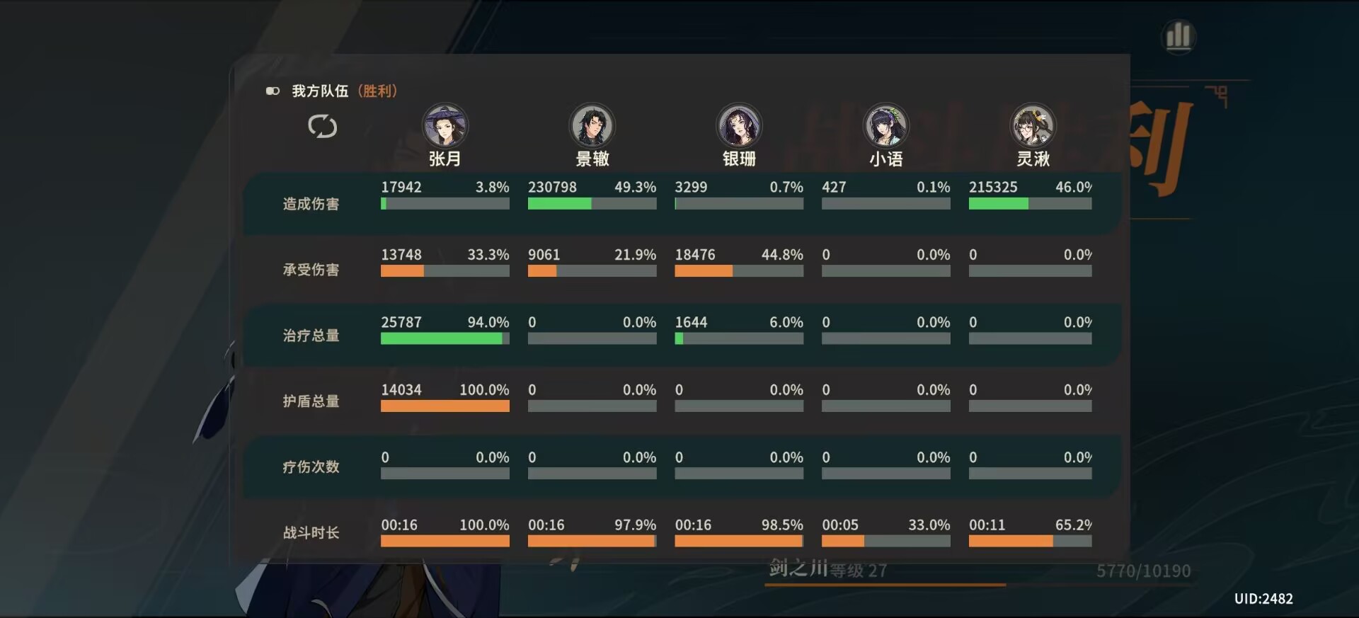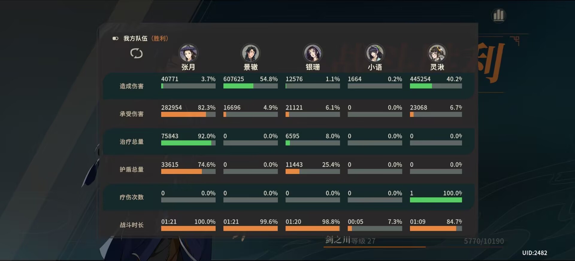 接下来上一组伤害分析,以下伤害截图中,均围绕景辙核心,给景辙上藏锋积锐,上如归剑魂的伤害。灵湫并未吃到任何策略卡的增益的伤害。这也是我为啥给灵湫打call的原因。灵湫能当拐子,也能当输出,还能当奶妈。