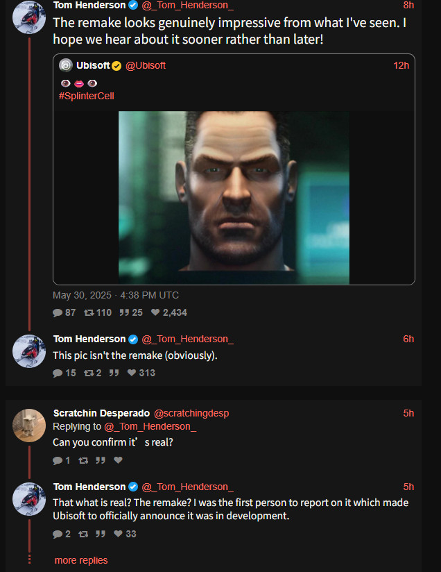 知名爆料人Tom Henderson最近透露,他看到的《细胞分裂:重制版》“确实相当惊艳”,表示希望能尽快听到更多消息。Tom Henderson还澄清,育碧官推附图并不是《细胞分裂:重制版》。