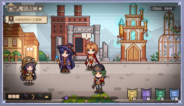 在[魔法之城]内,探索的过程中将会遇到不同的人物,触发剧情、任务、战斗及其他事件。触发结局后可读档回到过去的节点,通过不同的选择触发不同的后续事件。