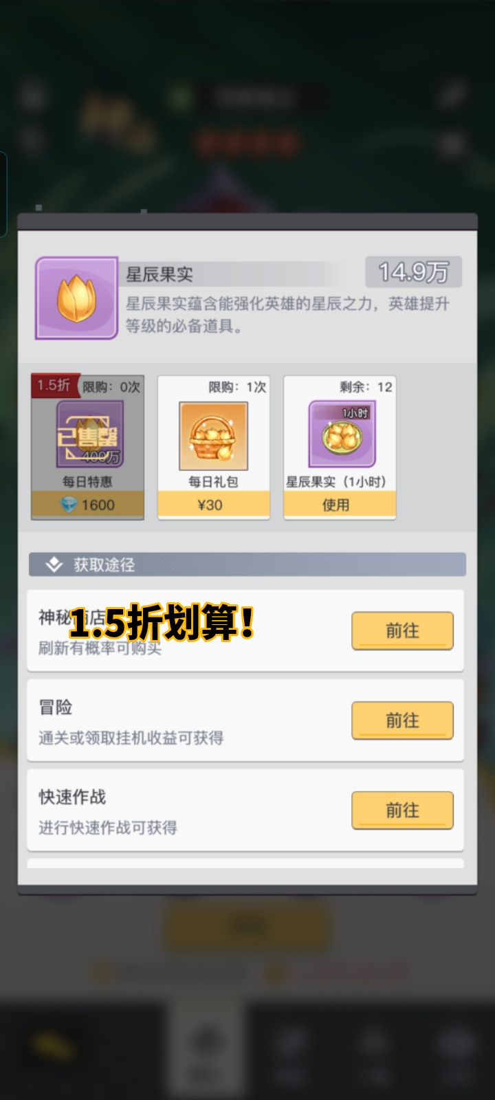 1.前5天金币/星辰果实买满,然后去计算还缺多少金币/星辰果实再补,金币是麒麟宝库每天早中晚3次;星辰果实是升级缺的时候弹出窗里买满620W经验(图2)。