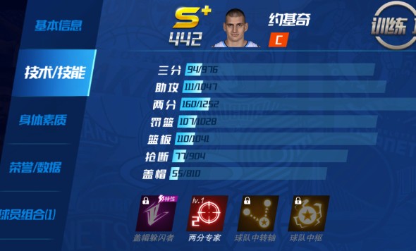 【三技能】球队中枢:灵活的胖子串联全队,在场时,队友进攻增加X%,对方全队防守减少Y%(消耗:中锋手册、组织训练卡、哑铃、尼古拉.约基奇训练计划、陪练教练为自己-大师级别)