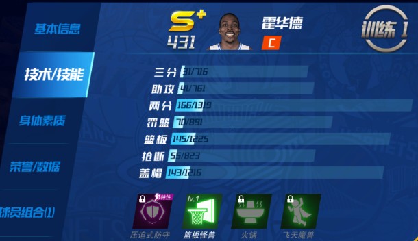 【三技能】飞天魔兽:魔兽降临,每盖帽一次,自身防守增加X%,对方大前锋和中锋进攻减少Y%,最多触发3次(消耗:中锋手册、盖帽训练卡、哑铃、德怀特.霍华德训练计划、陪练教练为自己-大师级别)