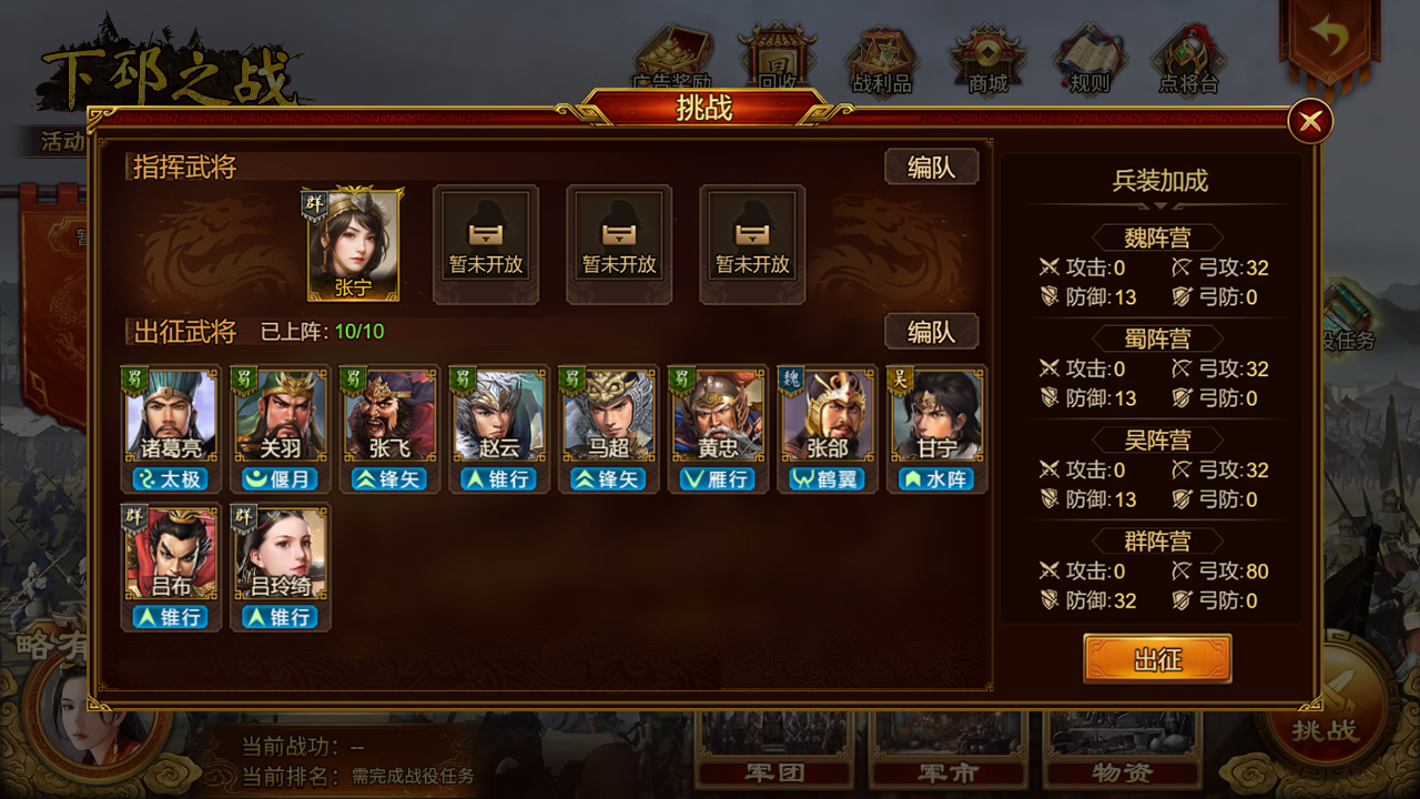 ● 解锁指挥技后,进入【治所】,依次选择【出征】-【指挥关卡】-【指挥武将】,即可进入对应指挥关卡;