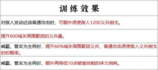 ●更高的义兵上限:自身义兵小于一定数量时将不会逃跑(可与 技能 聚义、指挥技兵法 坚忍不拔 效果叠加);