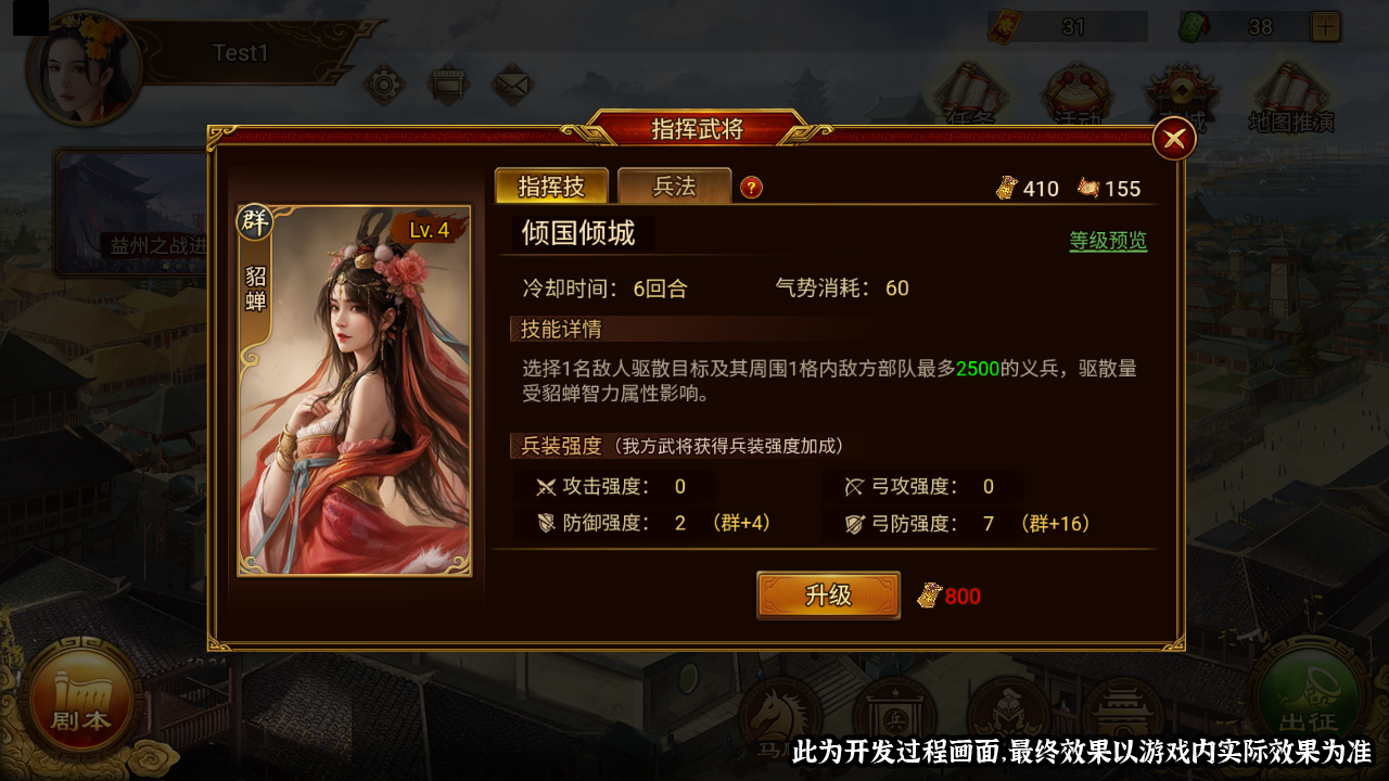 ※芳华绝代:使用倾国倾城时,使被选择目标范围内友军增加义兵。