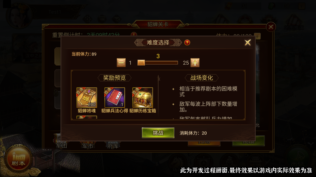 在治所中点击【出征】-【指挥关卡】,进入“貂蝉关卡”,有三幕挑战等待大家。