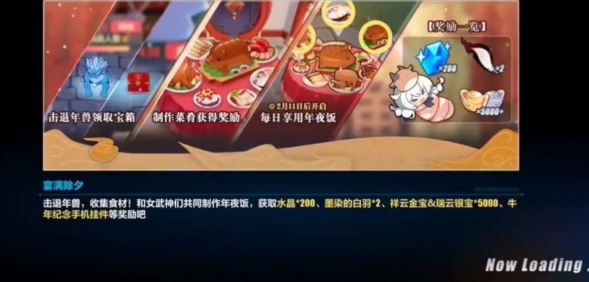 年兽停留时间结束时剩余血量越少,宝箱掉落的食材就越多,舰长们可以在菜肴筹备面板中消耗不同种类的食材制作菜肴并获得奖励,每种菜肴都有一定的制作次数上限。