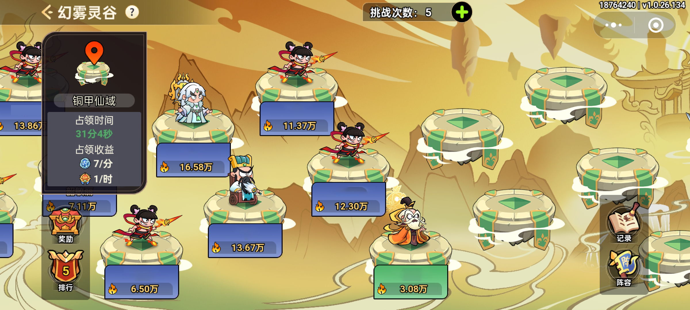 幻雾灵谷中占领品级越高的仙域,单位时间内获得的奖励就越多,每次占领最高可获得8小时的占领收益。所以大家可以量力而行,尽量抢占品级更好的仙域。每次抢占挑战成功后会有1小时的保护期。保护期期间,其他玩家不可抢占此仙域。幻雾灵谷的排行榜分为仙盟排行和个人排行,在确保自己占领收益的同时,也要保护仙盟的占领收益哟,因此尽量避免抢占同仙盟盟友的仙域。