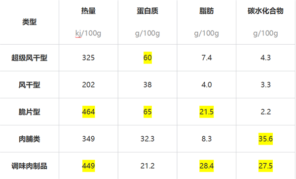 以调味肉制品为例,其平均热量高达 449kcal/100g,是风干型牛肉干的两倍多!有的品牌脂肪含量飙升至惊人的 37.6g/100g。