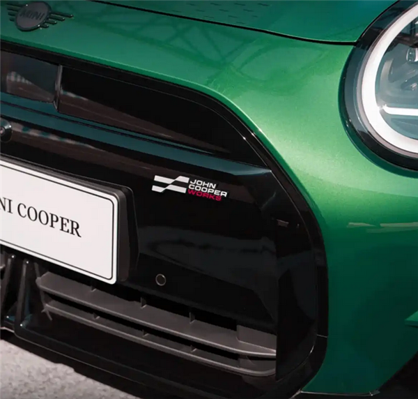 新车前脸配备黑化中网和运动夸张的下格栅,两侧设置导流槽,前盖上有格子旗元素拉花,中网融入JCW标识。