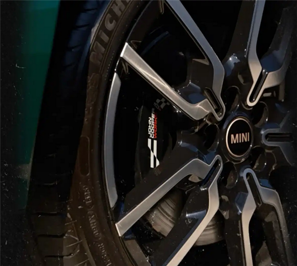 车身侧面同样运动感拉满,侧面配备JCW圈型双色轻质铝合金轮圈和运动刹车卡钳,尾部换装JCWMODE尾灯并增加风刀后扰流板。