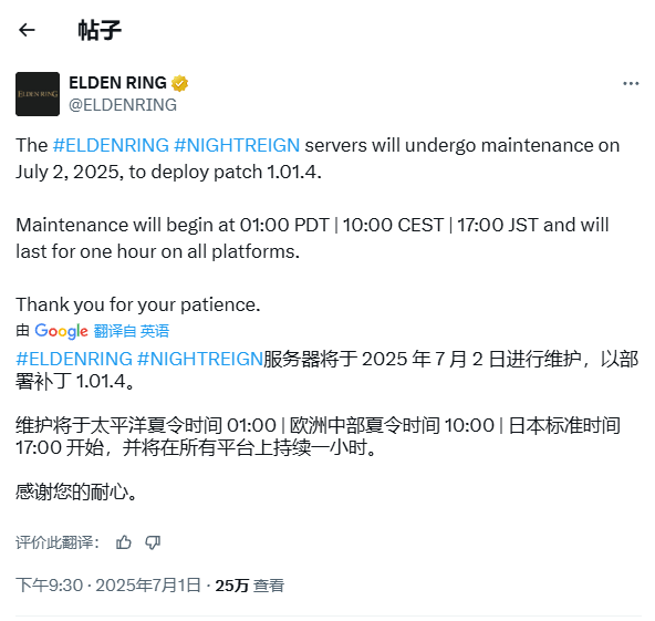 FS社宣布旗下联机肉鸽游戏《艾尔登法环:黑夜君临》将于北京时间7月2日下午16:00至17:00进行为期1小时的服务器维护维护,为1.01.4版本更新做准备。