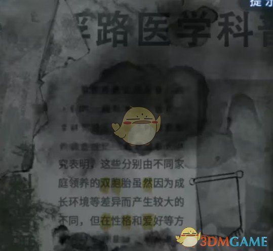 查看右边办公室的门,用【医用钳】开门,注意天花板小高能,开门进入办公室,查看左边的墙上挂上两面【锦旗】,但是还需要调整位置,查看右边墙上贴的纸条,重点是几个标了黄色的字,记下来【双胞然】【在格爱】。