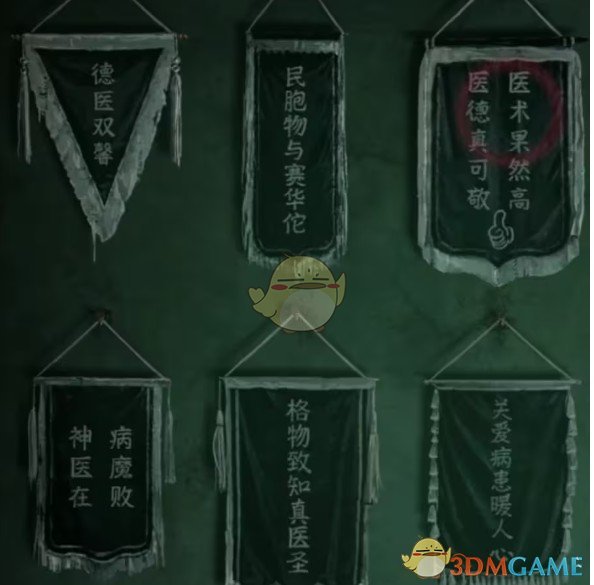 再查看一下锦旗,调整到对应第一行是【双胞然】第二行是【在格爱】,只要有这几个字就行不在乎位置的,调整完毕如下图,注意停尸柜打开小高能,从打开的柜门里拿到【三炷香】,然后按照里面伸出的手指的位置挨个点,顺序为【2-1】【3-3】【1-3】,打开【1-3】之后就能拿到一个布娃娃了,可以下楼了。