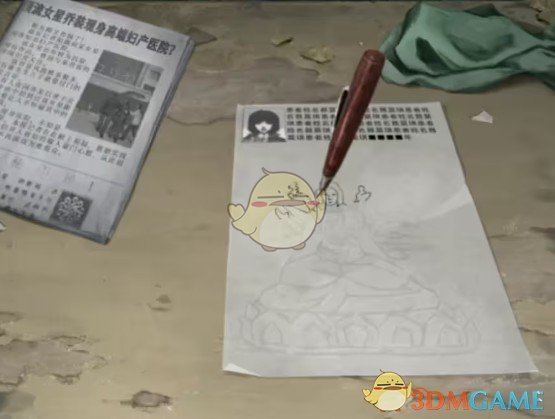 出门来到旁边办公室,对电脑旁边的打印机使用【墨盒】拿到【打印报告】,有提示说这个报告有很多空白的地方,所以我们再次回到右边房间,查看桌子对桌子上送子娘娘的位置使用【打印报告】之后使用【圆珠笔】就能开始临摹了。