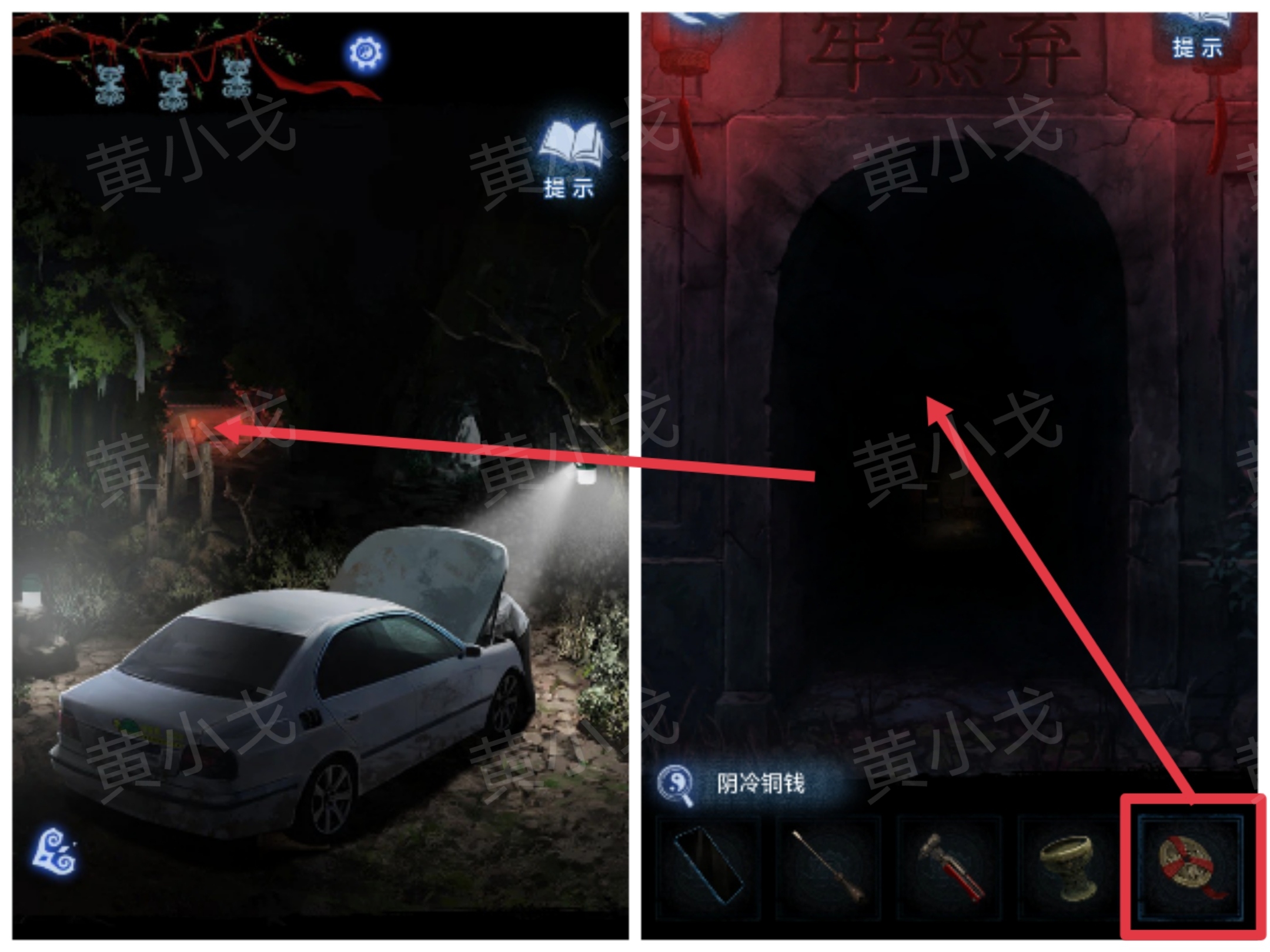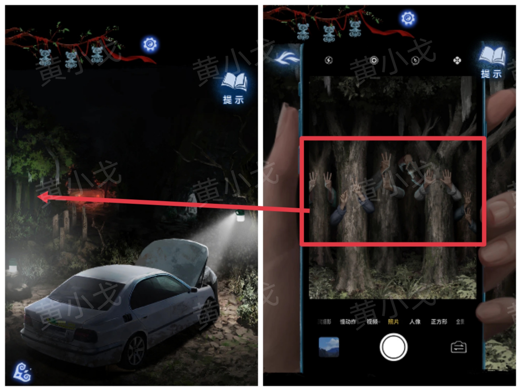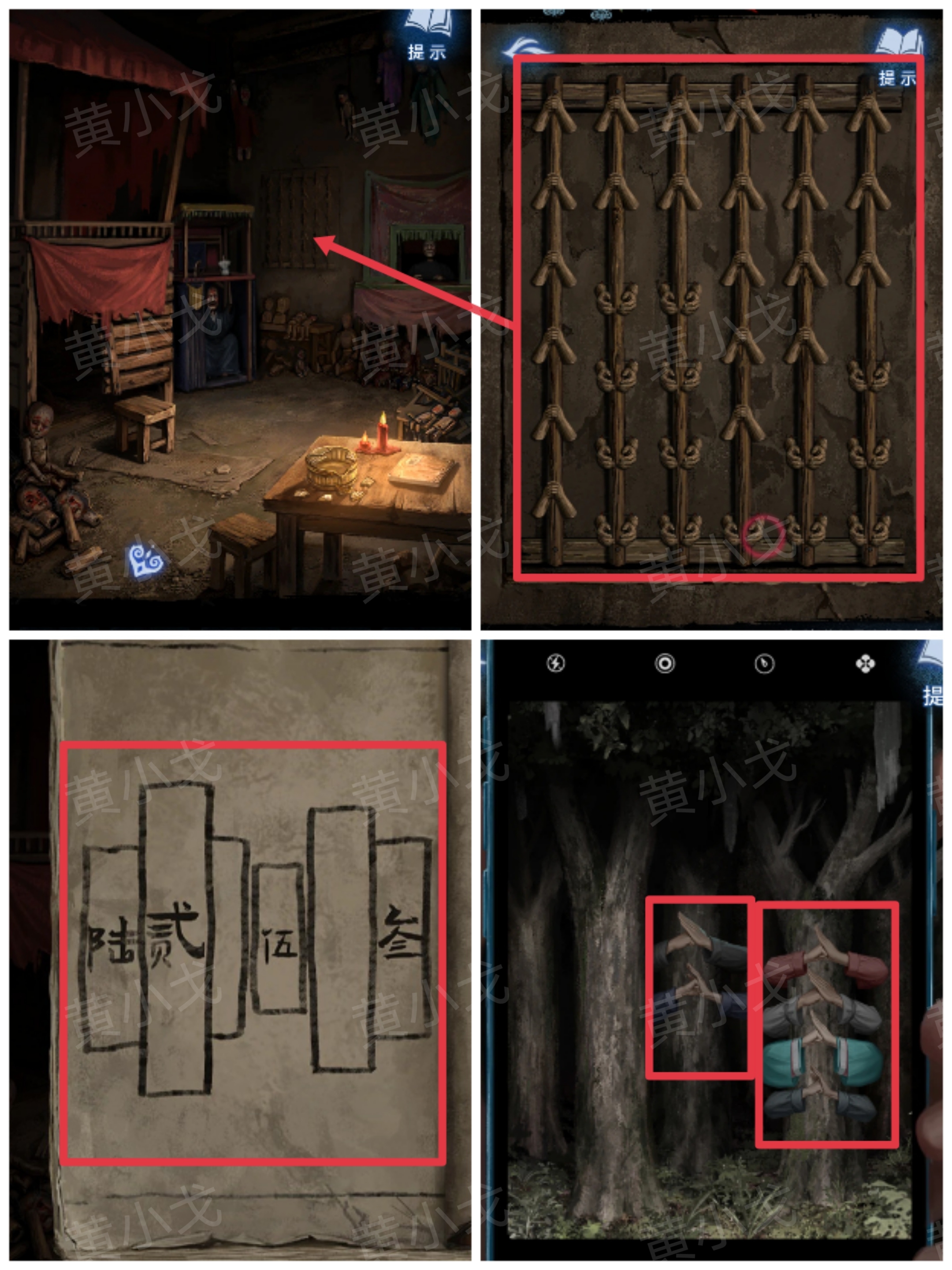 15.点击墙上的机关,根据《鬼術篇悟》上的线索和[车]场景通过手机观察树林得到的线索,调整机关