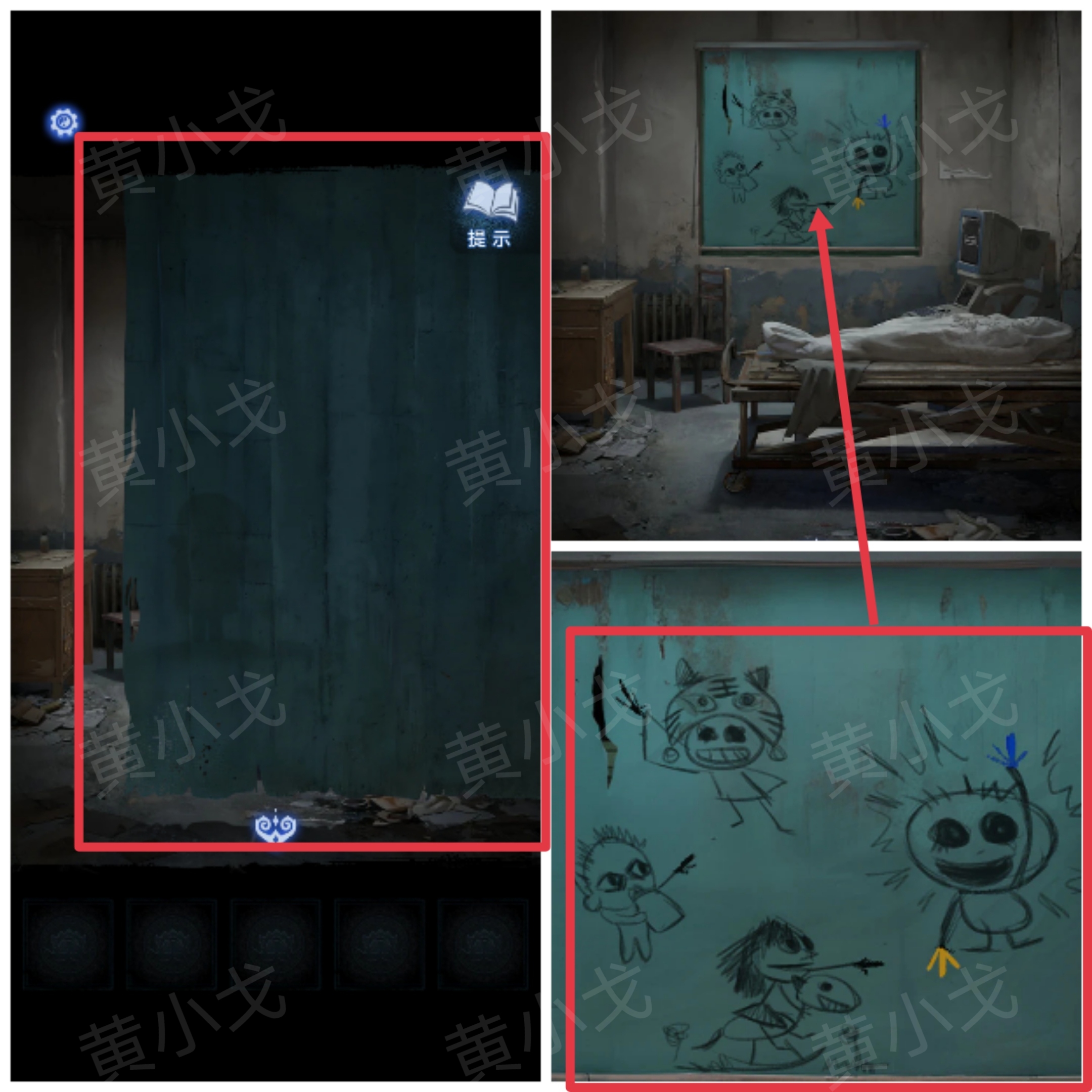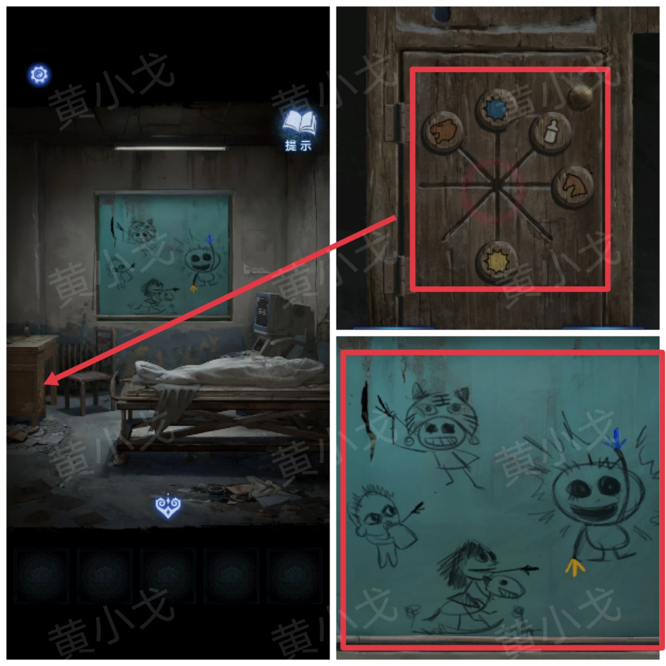 5.点击桌子的柜子上的密码锁,根据滑块上的图案,结合涂鸦上的线索,调整对应滑块的位置