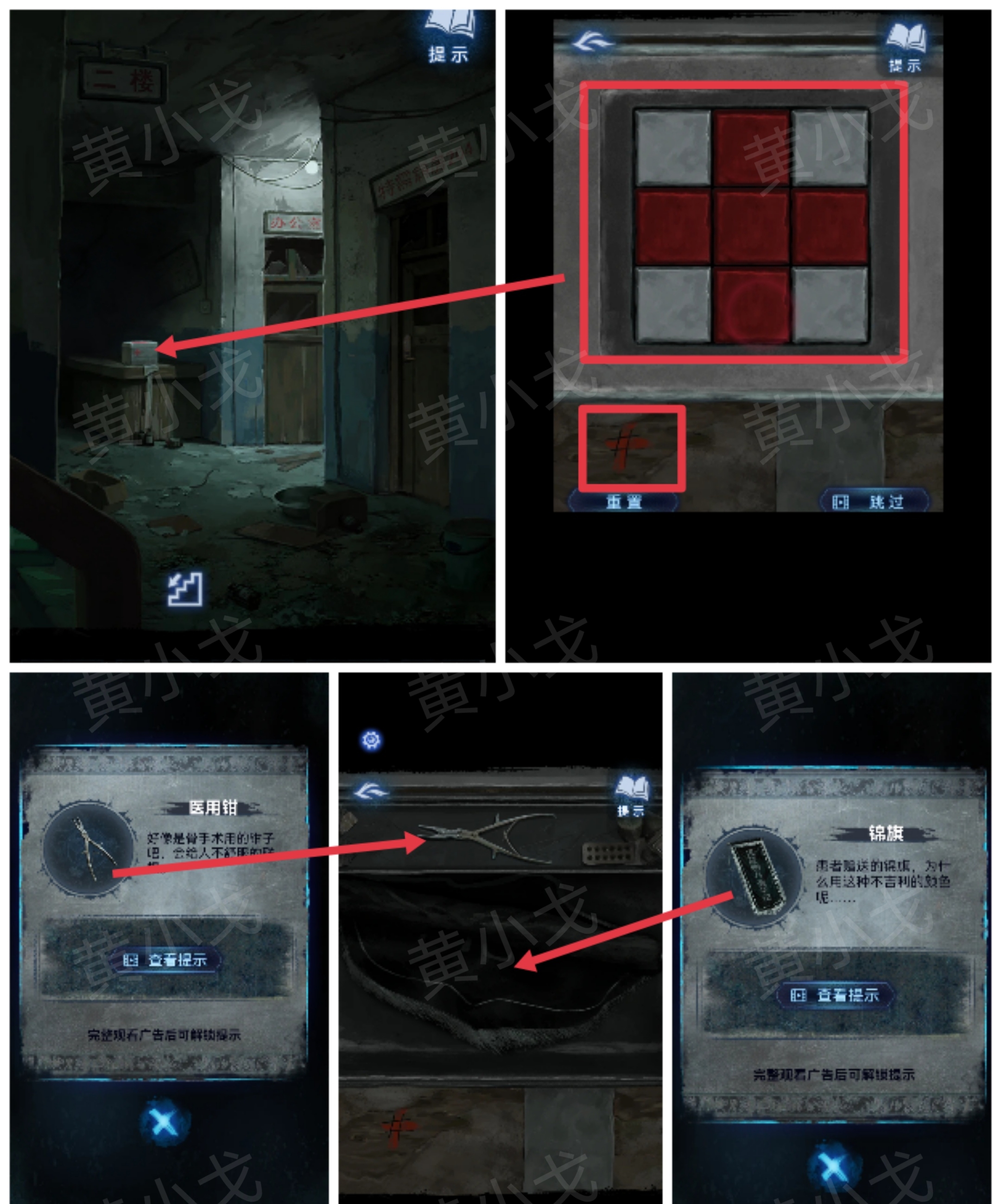 8.点击桌子上的医疗箱,根据上面的红十字图案提示,调整医疗箱上的密码锁为红十字图案;打开医疗箱,获得【医用钳】和【锦旗】