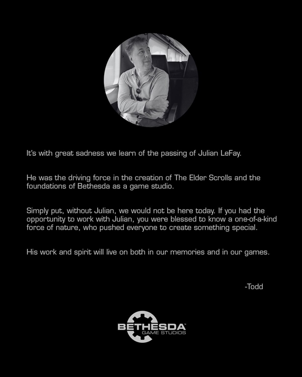 Bethesda工作室负责人Todd Howard发文致哀:“我们怀着无比沉痛的心情得知Julian LeFay的离世。他是《上古卷轴》的创作主力之一,也是奠定Bethesda作为游戏工作室根基的重要推手。坦白说,如果没有Julian,我们今天不会站在这里。”