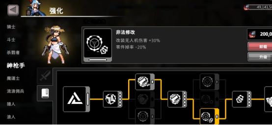 加点也是较为简单的,其中主加点可以选择比较常见的愤怒基本技能,攻击力能够增加50%,攻击速度增加20%,暴击率增加10%。附加点可选择贪婪,运气增加16%,初始黄金增加400.在天赋方面,主要输出是无人机发出的武器技能,因此伤害点满减掉率是并不需要过多担心的。此时改装无人机,也就是我们利用零件合成打造的武器,可搭载到神枪手腰上的无人机。