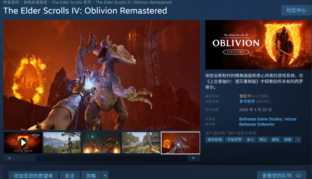 B社宣布《上古卷轴4:湮灭重制版》自4月22日发售以来,玩家人数突破900万人。