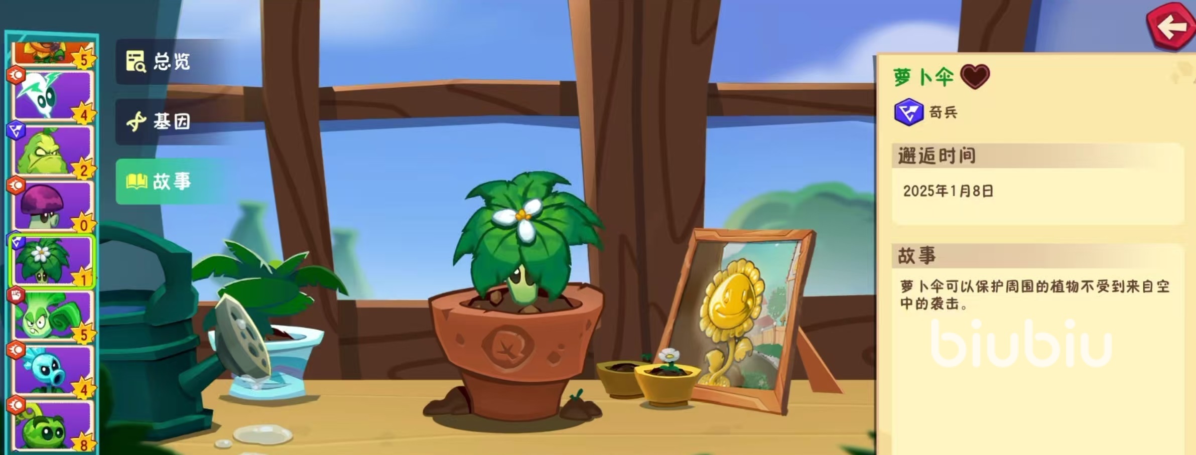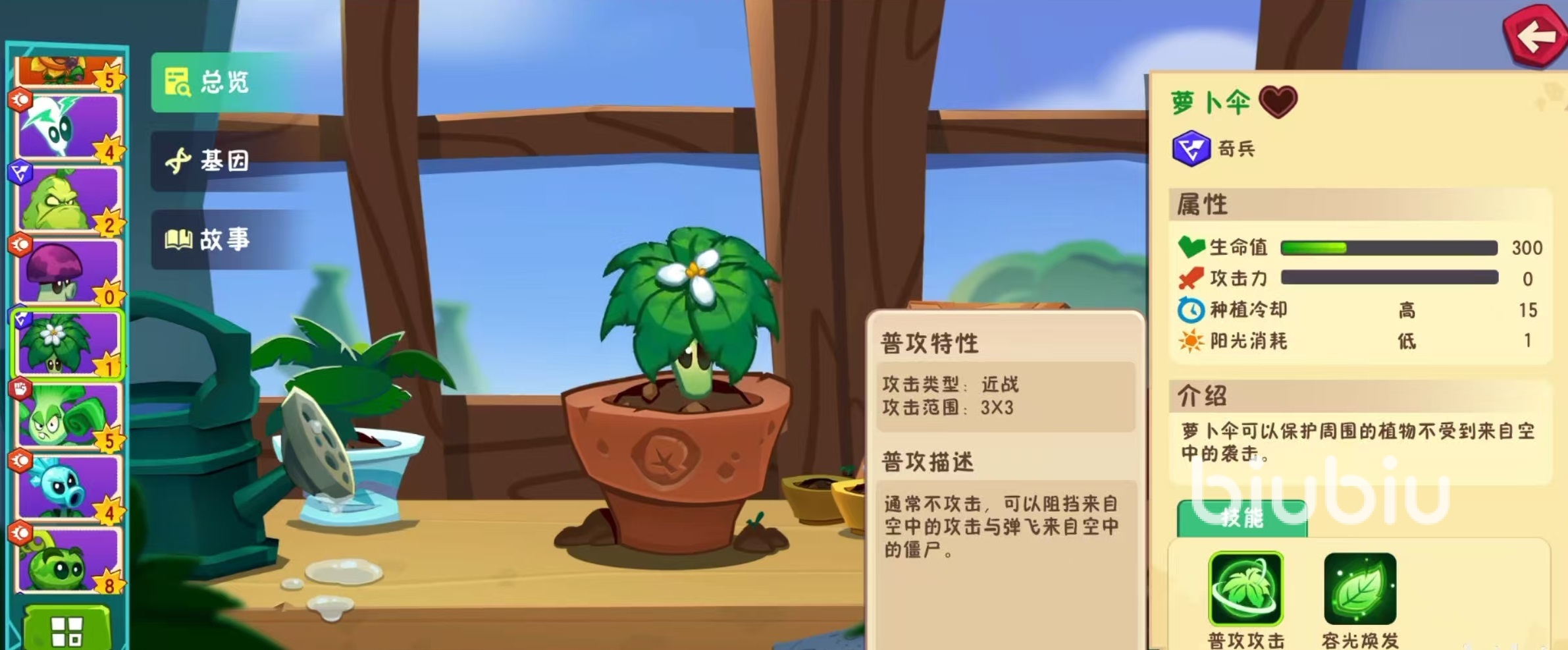 萝卜伞曾经是一个胆小鬼,直到它找到自己的使命守护之后,现在已经成为了可以保护植物们的好大哥。当玩家在通关城区第6关之后,就可以获得萝卜伞这个植物。需要消耗1点阳光,种植冷却时间比较长,生命值较低。它的能力是可以保护周围的植物不受到来自空中的袭击。通过这个技能效果特点不难看出,这个植物还是有着很关键作用的。因为在游戏中并不是完全的地面战斗,很多时候要面对来自各个方面的攻击,空中攻击也是一类。