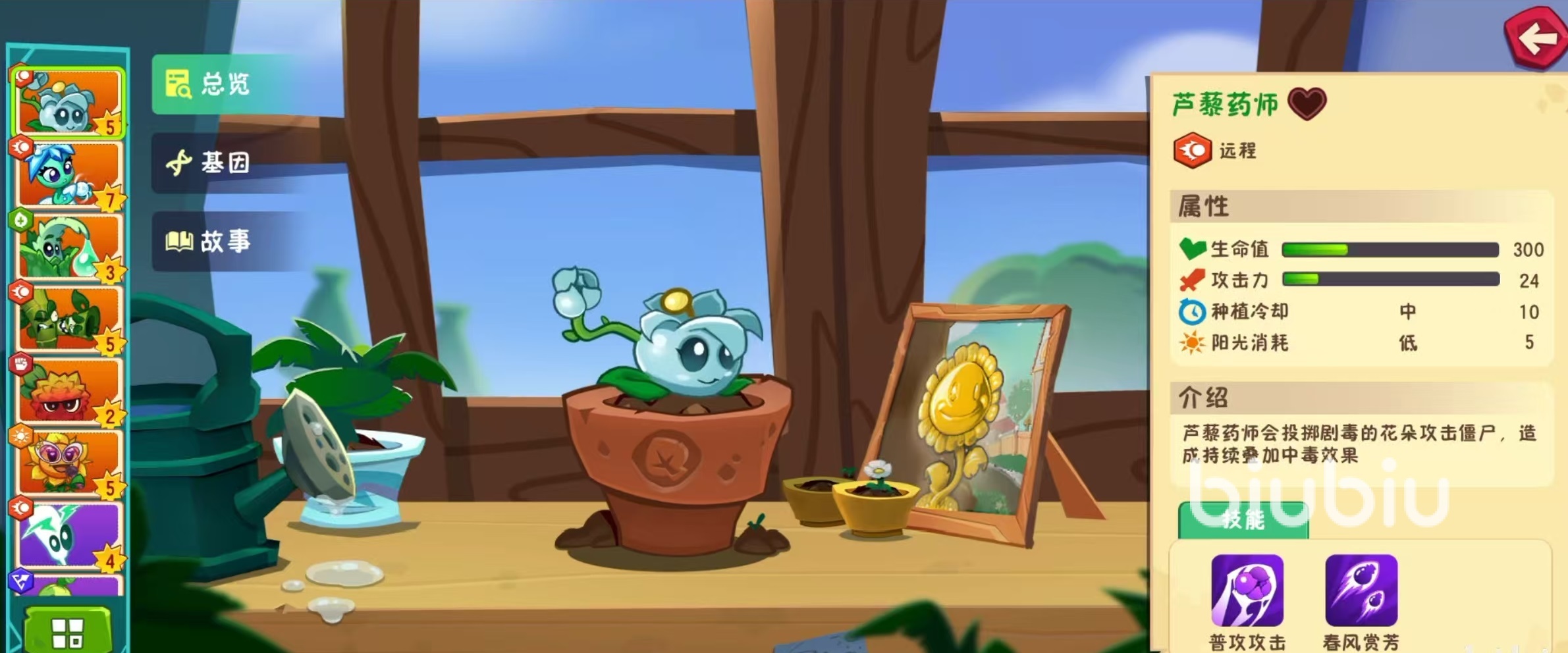 芦藜药师是属于远程输出类型,自身的生命值300,点攻击力24,种植冷却中等,阳光消耗低,只需要5点阳光就可以种植下去。芦藜药师可以投掷剧毒的花朵去攻击僵尸,造成持续叠加中毒效果,他的攻击技能有两个,分别是普通攻击和春风赏芳。