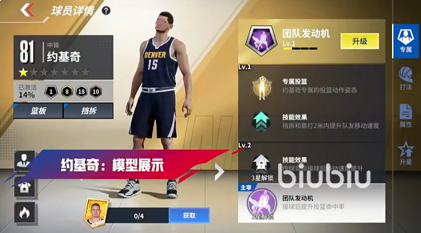 专属技能“团队发动机”,在拆档时,持球队友的移动速度每秒提升0.15米,效果持续2秒,靠打时队友的移动速度拥有同样程度的提升效果,升星之后的技能效果更佳;处于一级时就能获得专属的投篮动作,该技能十分方便队友跑位拉扯对手防线。