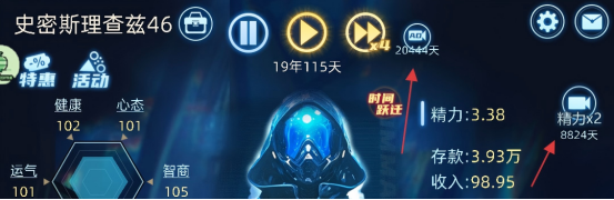 2.把这两个小广告看完,可以领取25年份的时间加速和双倍精力,这样就可以把时间流逝速度调到2~4倍,基本上一个轮回看一次就够用了