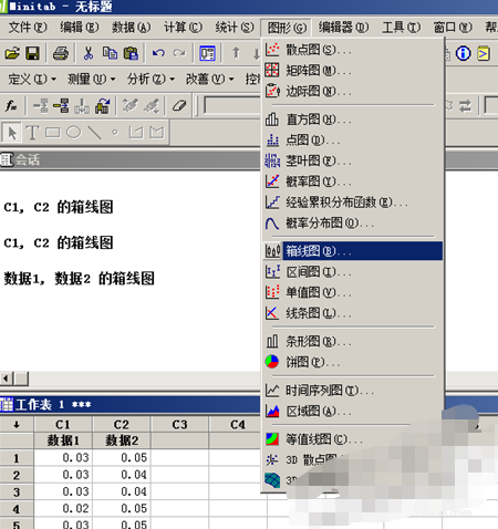 2.我们将准备好的数据输入到minitab中,输入的时候已经要注意不要输入错误了,然后点击界面上的图形-箱线图。