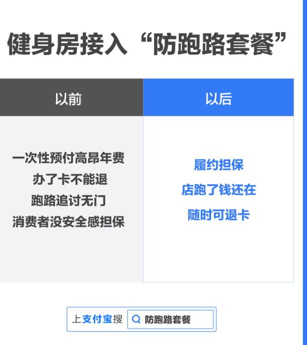 4 月 23 日,支付宝开放平台联合网商银行、芝麻信用推出“防跑路套餐”,通过技术手段保障消费者权益,也让正规商家能更好的做生意。目前该套餐已在健身行业试点,首批已有超 2000 家健身机构加入。