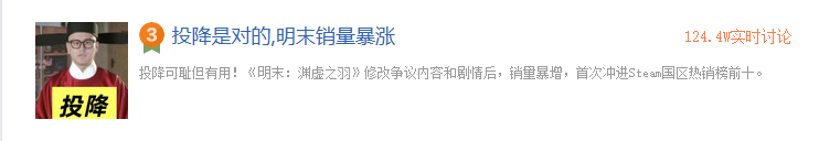 截至目前,“投降是对的,明末销量暴涨”关键词登上了百度贴吧热议榜第三名,引来各路玩家热议。