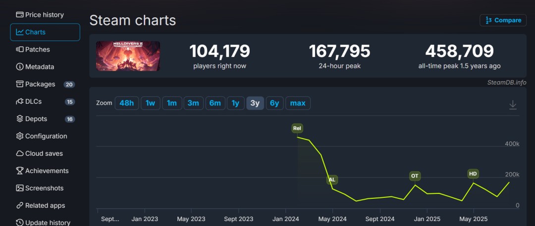 SteamDB显示,8月26日当天,《绝地潜兵2》Steam同时在线人数16万7795人,是2024年4月以来最高值,这一数字高于“Omens of Tyranny”和“民主之心”更新后的峰值,表明Xbox发布的影响不仅仅局限于一个平台。
