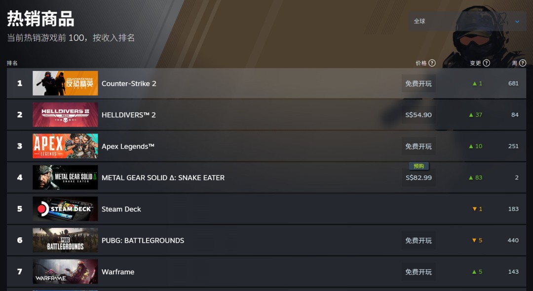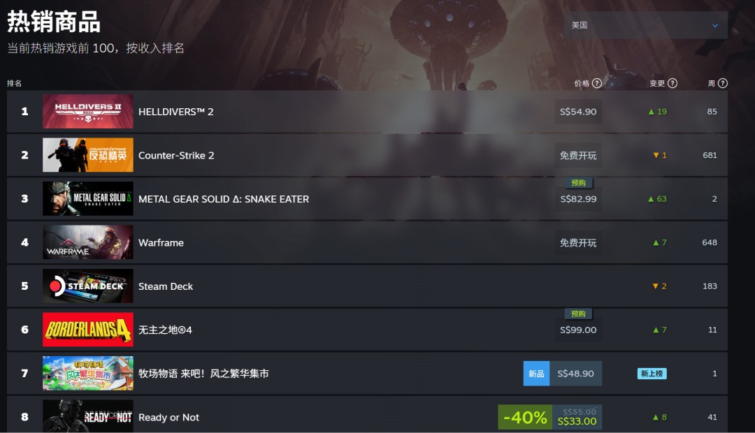 在Steam上,《绝地潜兵2》跻身Steam美国地区最畅销的游戏(按照收入),而在英国,排名第二,在全球地区,仅次于《CS2》,位列第二名。