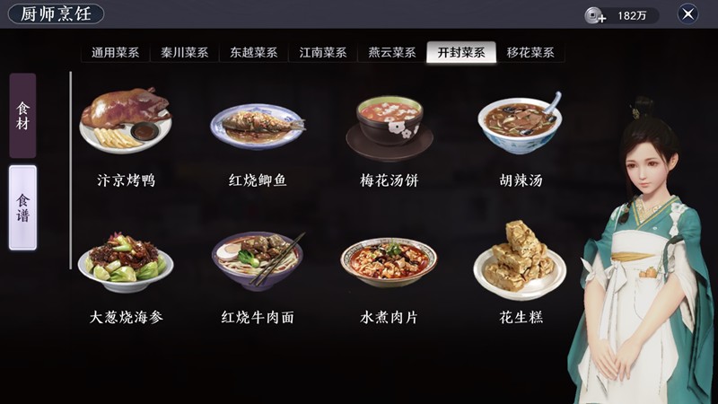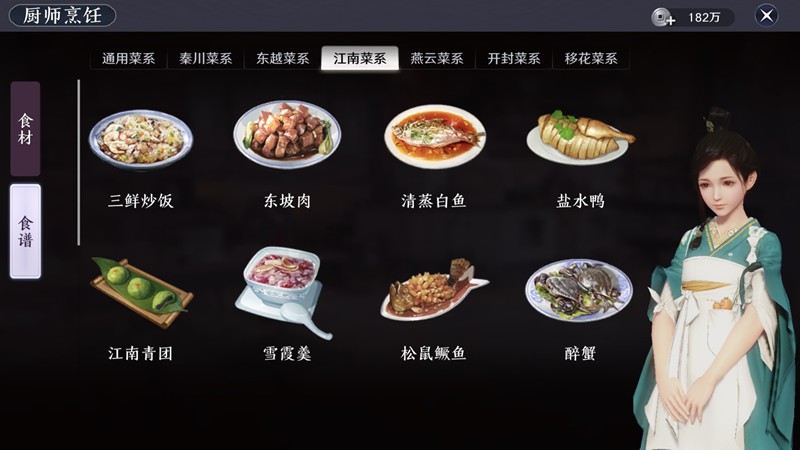 海鲜面需要面粉、河虾、调料和辅料制作。荷花血鸭由鸭肉、辣椒、荷花和调料组成,能恢复30000点气血储备。清蒸鲈鱼使用河鲈、料酒、调料和辅料,可恢复16000点气血。鱼羊双鲜需要羊腿肉、鲫鱼、调料和辅料制作。