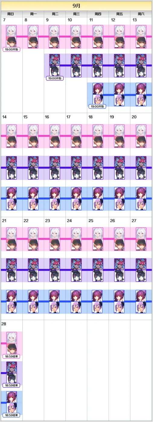 然后就是之前半月刊提到的国服自制卡池,也就是把泳装7期卡池复刻了一遍。9月7日~9月28日开启旧梅和水加雷斯卡池,9月9日~9月28日开启水伊吹和仇绘卡池,9月11日~9月28日开启RBA和水武后卡池。