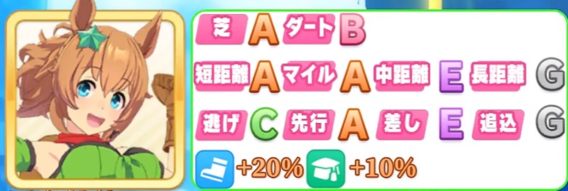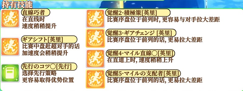 觉醒后获得的四个新技能进一步强化了她的比赛能力。"积极应对"和"换挡"让她在比赛初期更容易建立优势,"一哩直线"和"一哩支配者"则专门强化了在一哩距离直道上的表现。