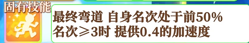 大树快车的固有技能"最终冲刺"能在最终弯道时提供0.4的加速度,前提是此前取得过三次以上前50%的排名。这个技能让她在比赛后半程拥有极强的爆发力,是反超对手的关键。