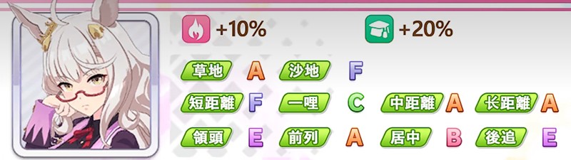 琵琶晨光的基础属性显示她最适合草地赛道的中长距离比赛,同时在一哩距离的赛事中也有不错的表现。她的跑法以居中为主,这种跑法在比赛中往往能取得稳定的发挥。不过在其他距离和跑法上,她的表现就相对普通了。她的固有技能"晨光之舞"能在最后弯道时通过从前方赶超来获得速度提升,这个技能在比赛后期往往能起到关键作用。