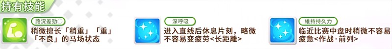 琵琶晨光初始拥有三个实用技能。"路况差劲"能帮助她在稍重、重和不良场地条件下保持稳定的表现;"深呼吸"让她在进入直线后不易疲劳;"维持持久力"则能有效减少比赛中段的体力消耗。这些技能组合大大提升了她的比赛续航能力和容错率。